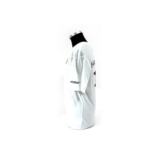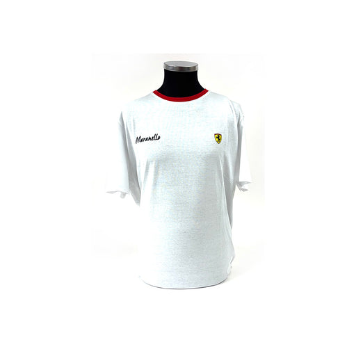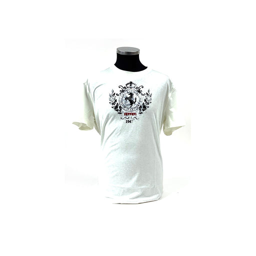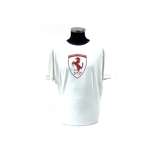View full detailsScuderia Ferrari short sleeve T-shirt, finished in white, a large Scudetto rubber Shield across the front. Red stitching along the bottom of the sl...