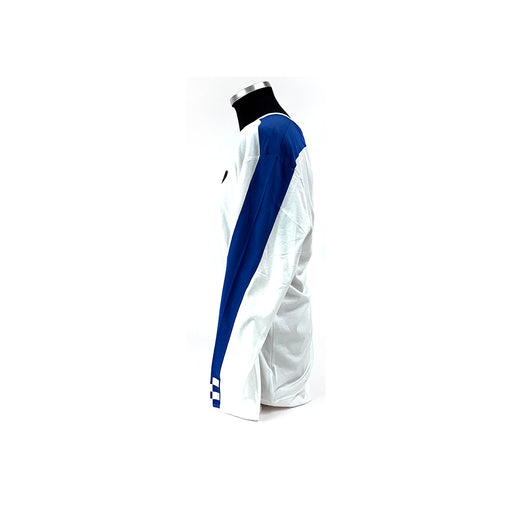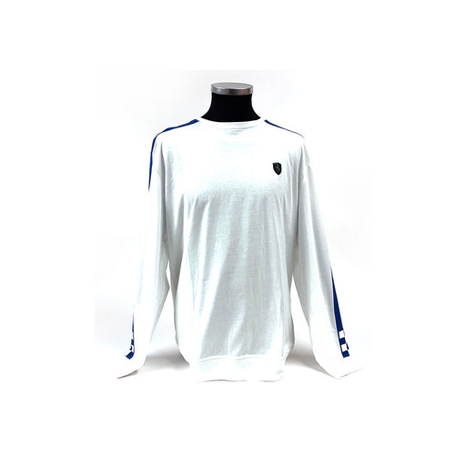 View full detailsMens Long Sleeve soft cotton Tee, black and silver Ferrari shield on the left chest, Blue stripe running all the way down the arms finishing into a...