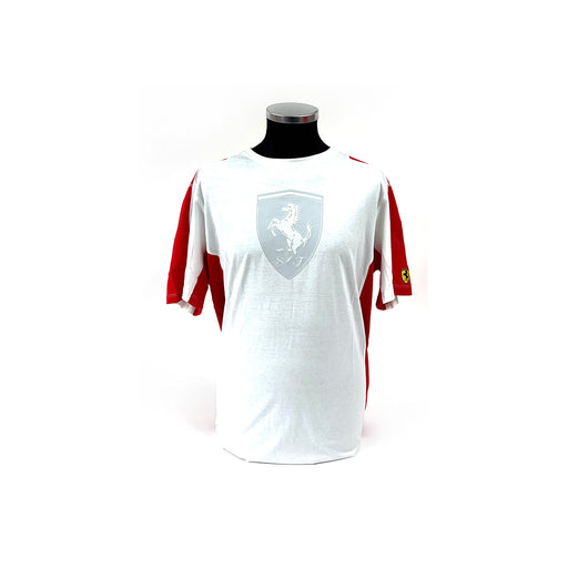 View full detailsScuderia Ferrari short sleeve T-shirt, finished in white, a large Scudetto rubber Shield across the front. Red panels along the sleeves, and down t...