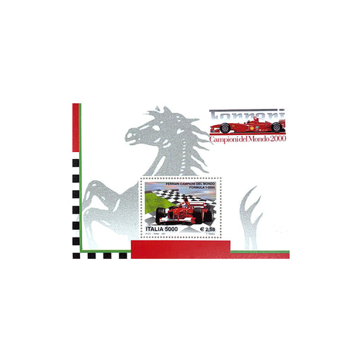 Perforated mini sheet containing a 2001 stamp. Featuring Ferrari 2000 Formula 1 World Champion. Overall Size 80 x 110mm Condition - Mint